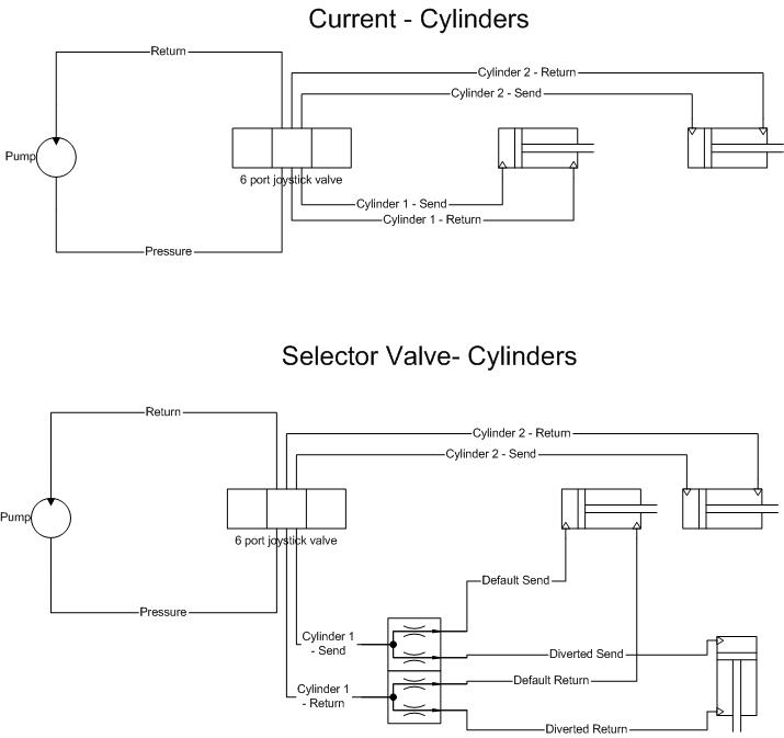 See Charlie Iliff's posts in this Joystick Circuit Selector Button thread on TBN for his description of the setup he added to his PT-1845 (see a picture of valve installation and a picture of the button). Charlie used a solenoid operated double acting diverter valve he bought from W R Long (supplier of his 4 in 1 bucket).